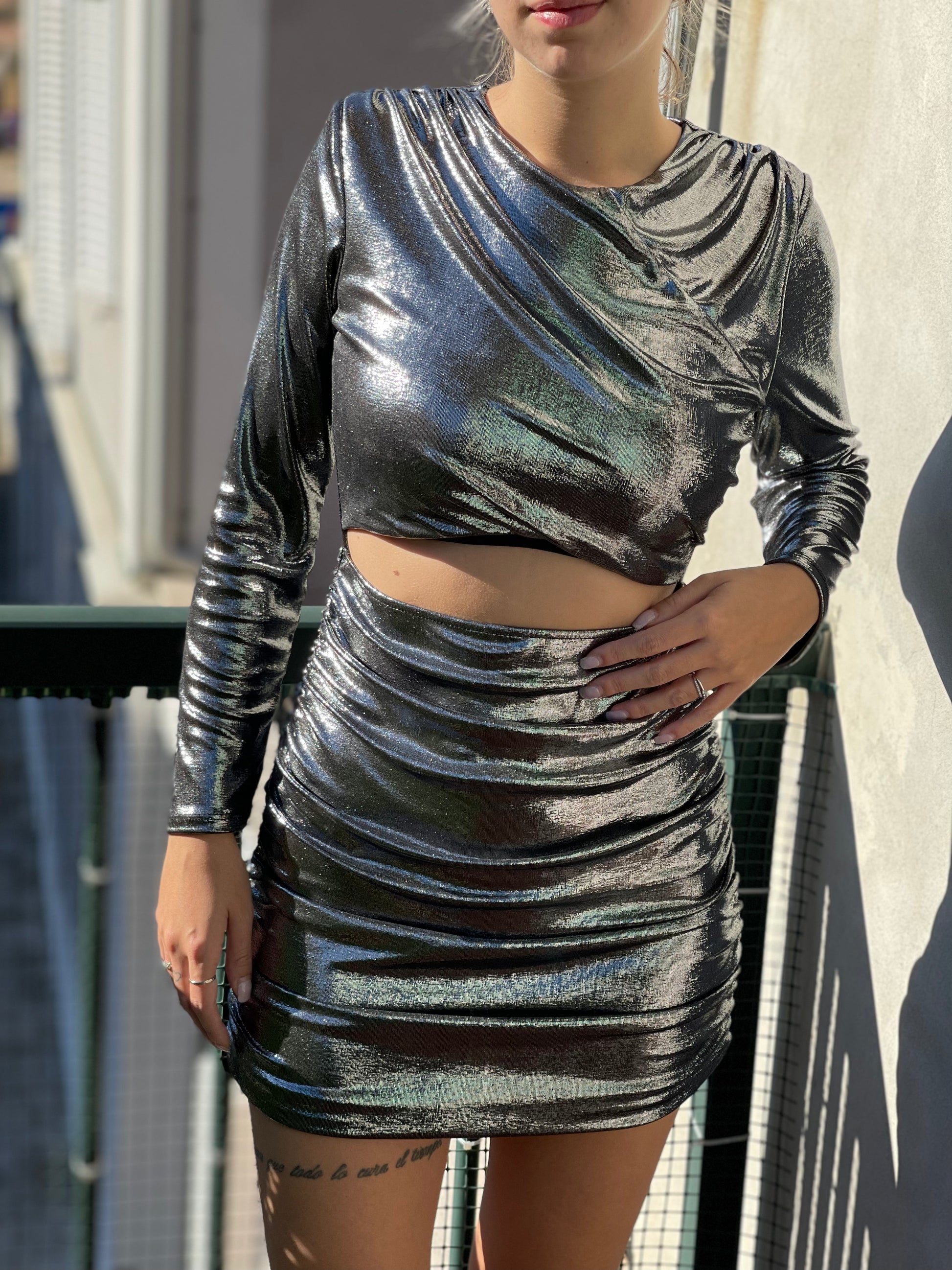 Abito laminato argento, con spalline e drappeggiato ai lati e dietro