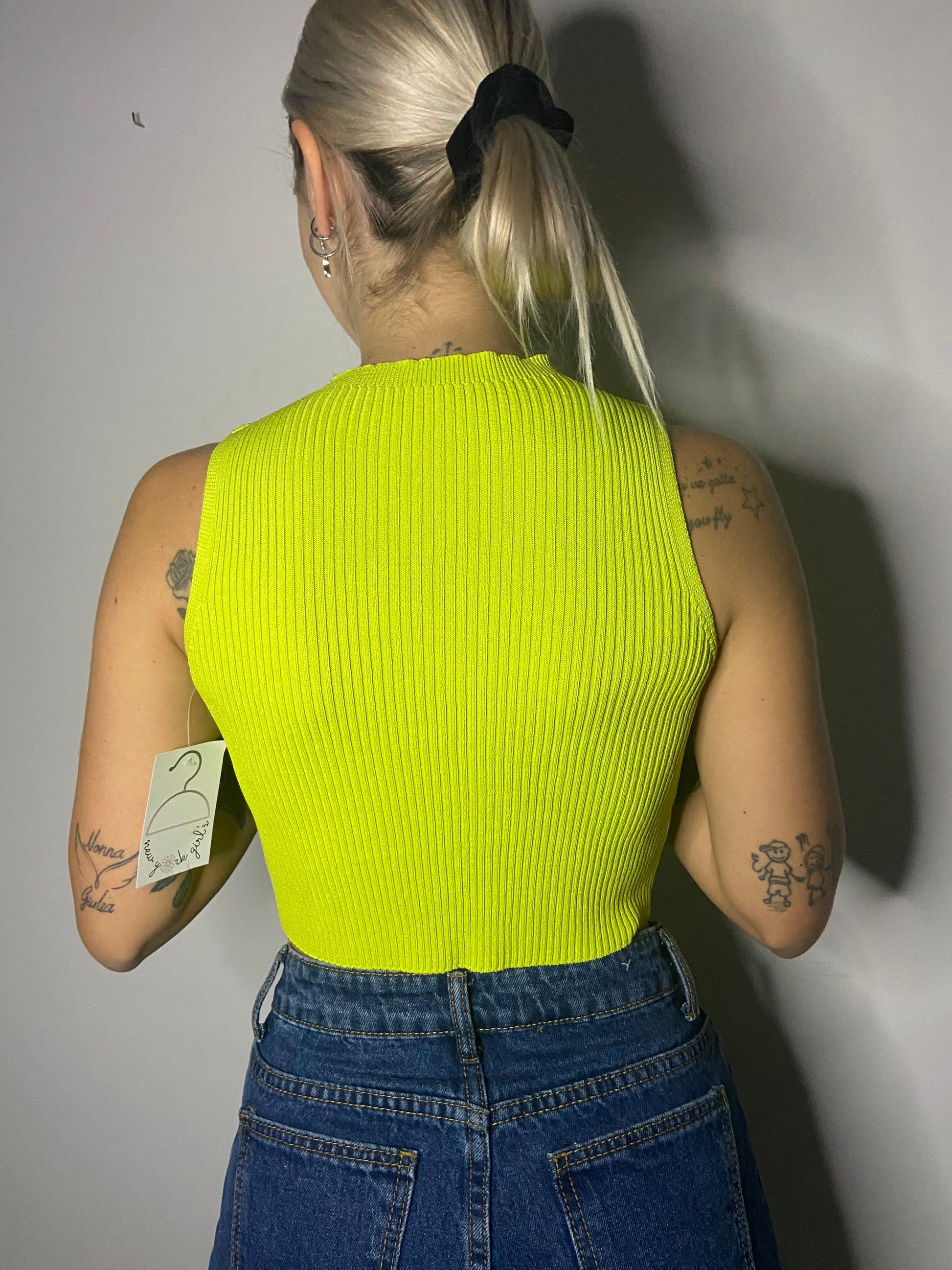 Top a costine lime con apertura lacci glitter